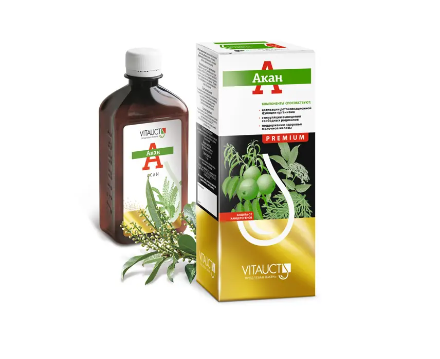 Акан раствор - это густоватая жидкость от коричневого до красновато-коричневого цвета с характерным запахом; допустимо наличие опалесценции, помутнение или выпадение осадка, что не влияет на качество и действие данного фитокомплекса.