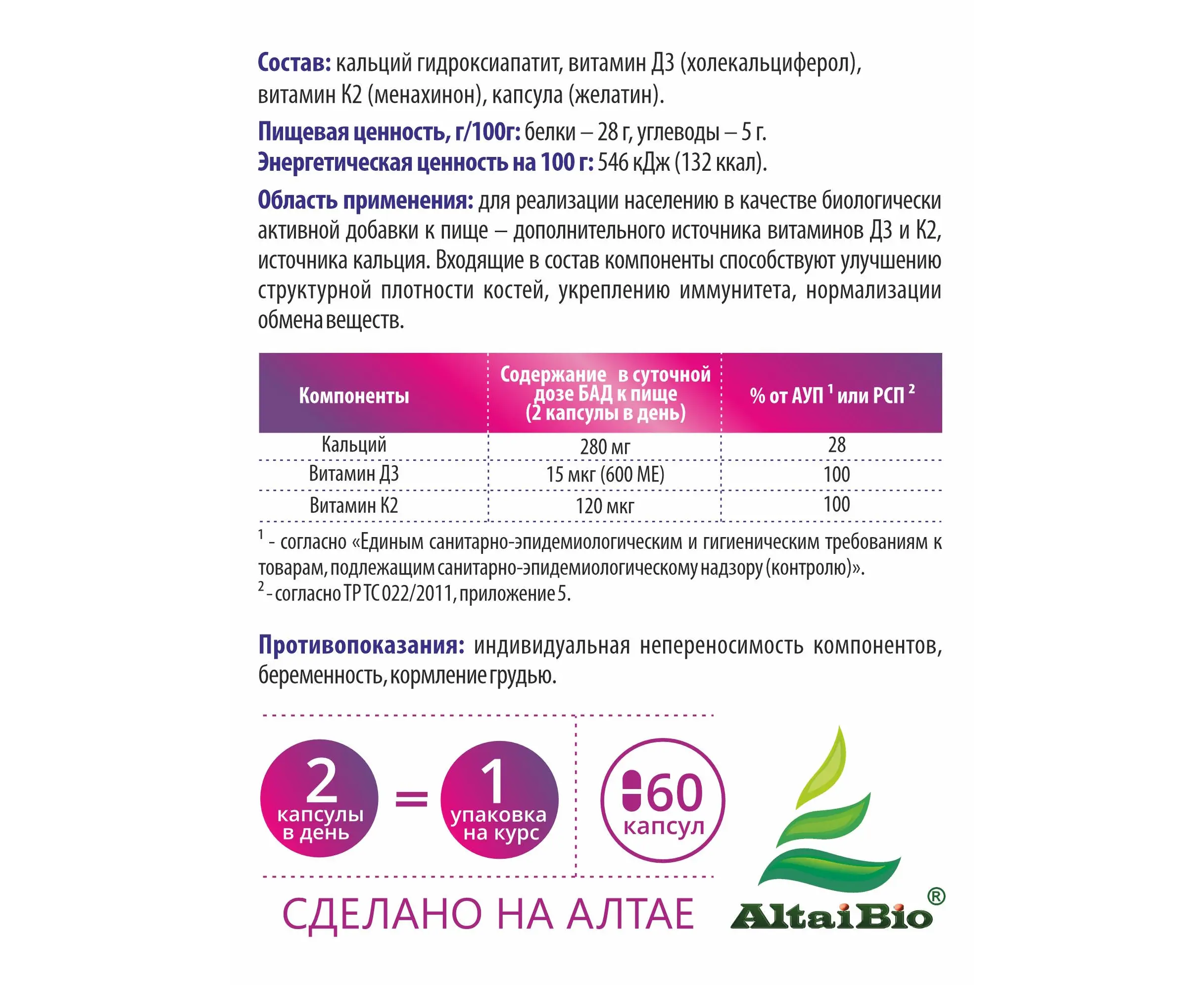 Гидроксиапатит кальция, Витамин Д3 (холекальциферол), Витамин К2 (менахинон), капсула желатиновая