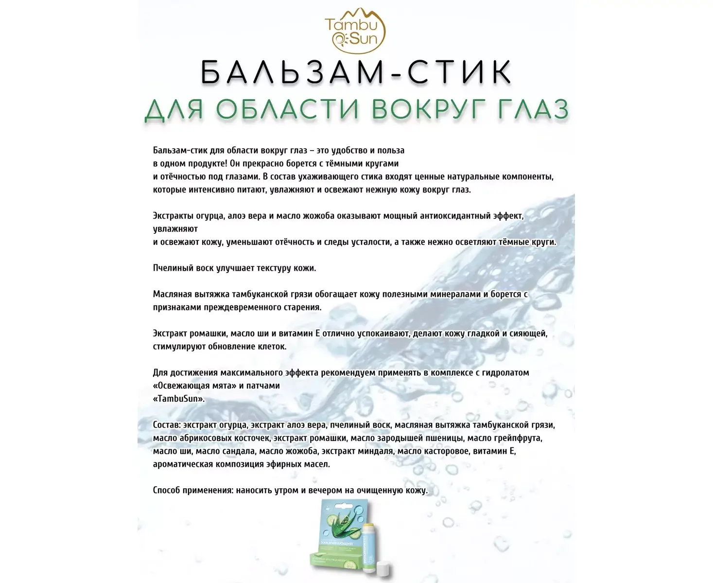 и отёчностью под глазами. В состав ухаживающего стика входят ценные натуральные компоненты, которые интенсивно питают, увлажняют и освежают нежную кожу вокруг глаз.