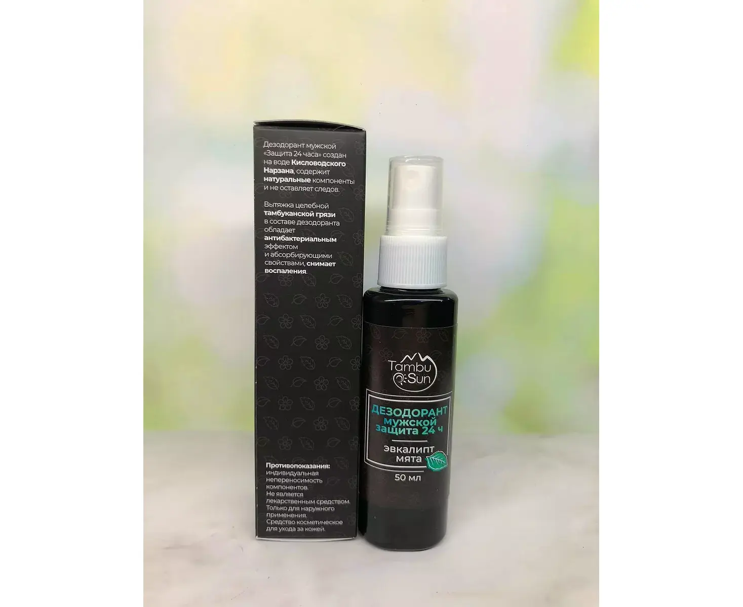 Дезодорант мужской «Защита 24 часа» созданна воде Кисловодского Нарзана, содержит натуральные компоненты и не оставляет следов. Вытяжка целебной тамбуканской грязи в составе дезодоранта обладает антибактериальным эффектом и абсорбирующими свойствами, снимает воспаления.