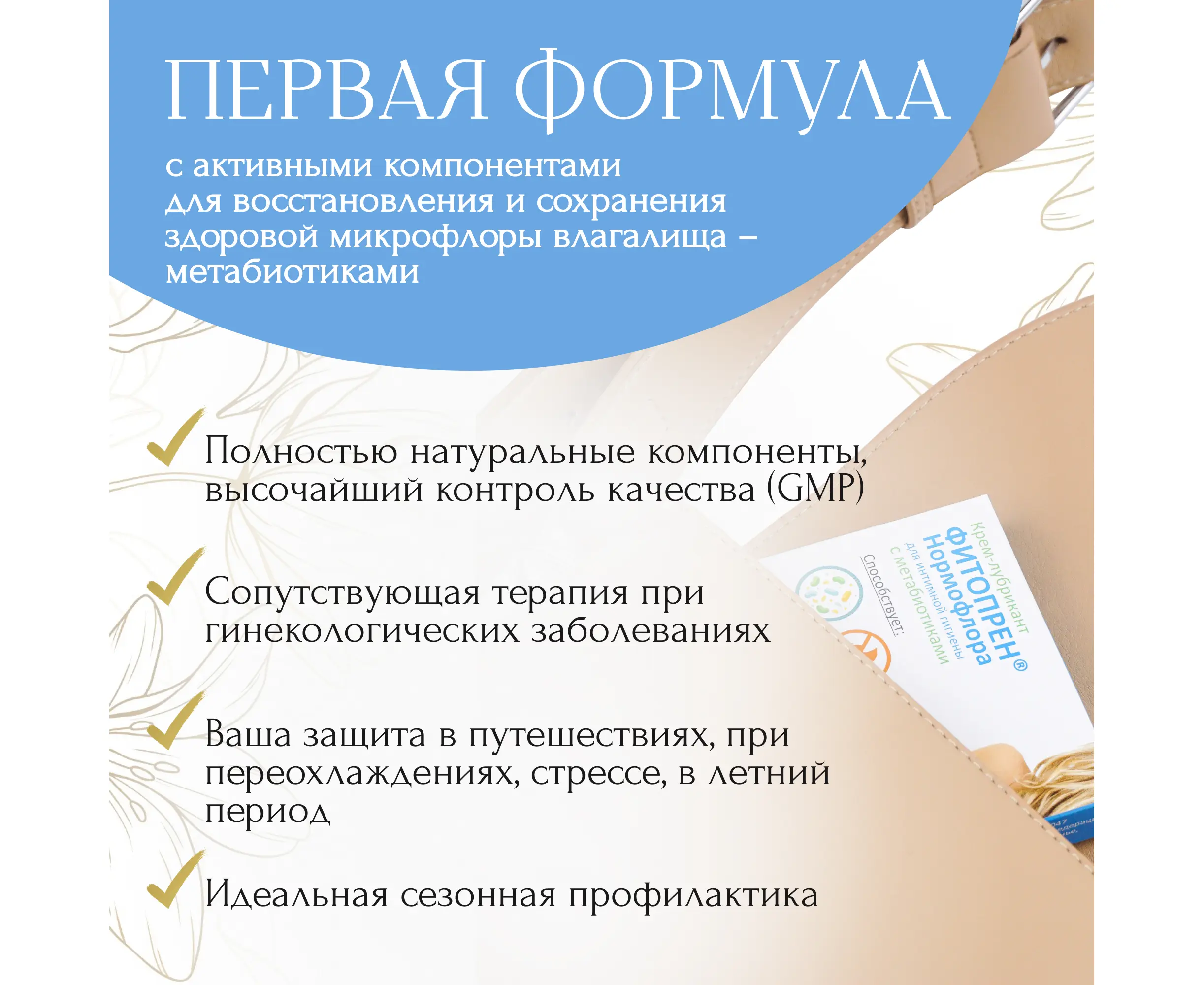 "Фитопрен® Нормофлора" - всесторонняя натуральная помощь при дисбиозе и любых других нарушениях в интимной зоне, которая качественно восстанавливает микрофлору и слизистую половых органов, параллельно убирая неприятные ощущения и активируя местный иммунитет.