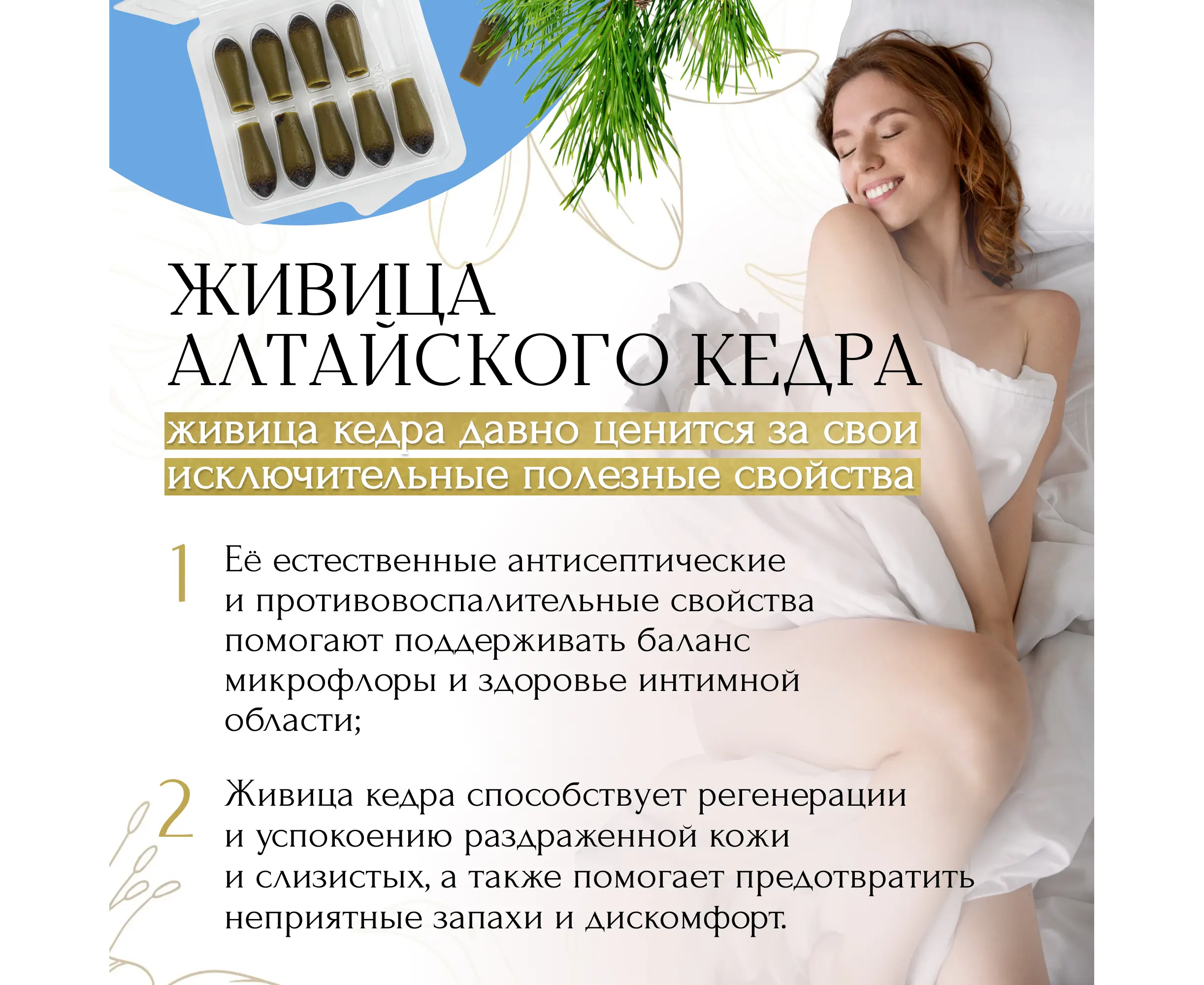 Масло какао, хлорофилло-каротиновая паста пихты сибирской, живица кедра сибирского, парафин; метабиотики: лизаты бифидобактерий (Bifidobacterium longum, Bifidobacterium bifidum, Bifidobacterium adolescentis), лактобактерий (Lactobacillus acidophilus, Lactobacillus fermentum, Lactobacillus bulgaricus), стрептококковых (Str. Thermophilus) и пропионовокислых бактерий (Propionibacterium shermanii)