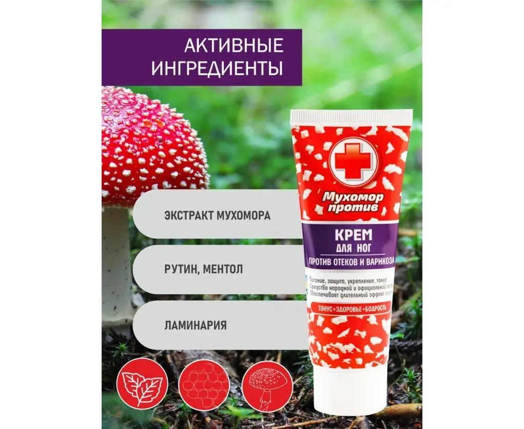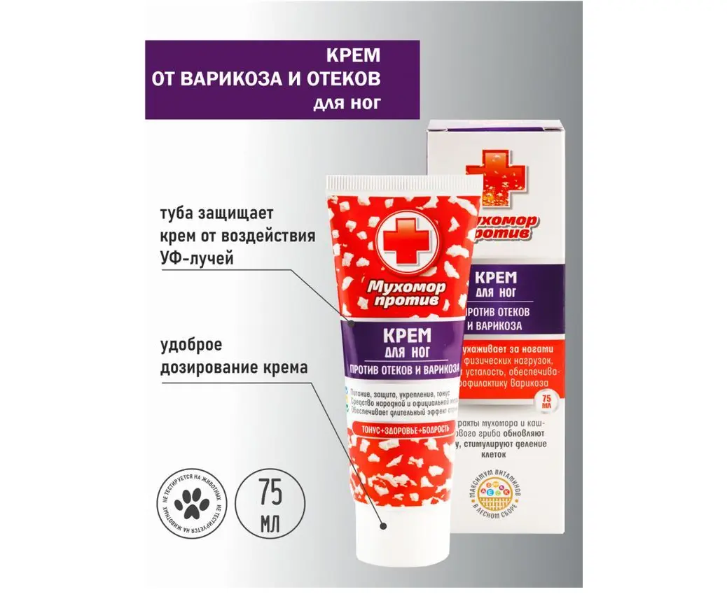 Описание Крем для ног против варикоза отеков, усталости, "Мухомор против", 75 мл., Венец Сибири