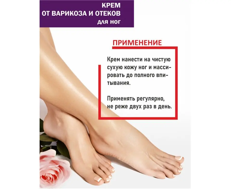 Крем нанести на чистую сухую кожу ног и массировать до полного впитывания. Применять регулярно, не реже двух раз в день.