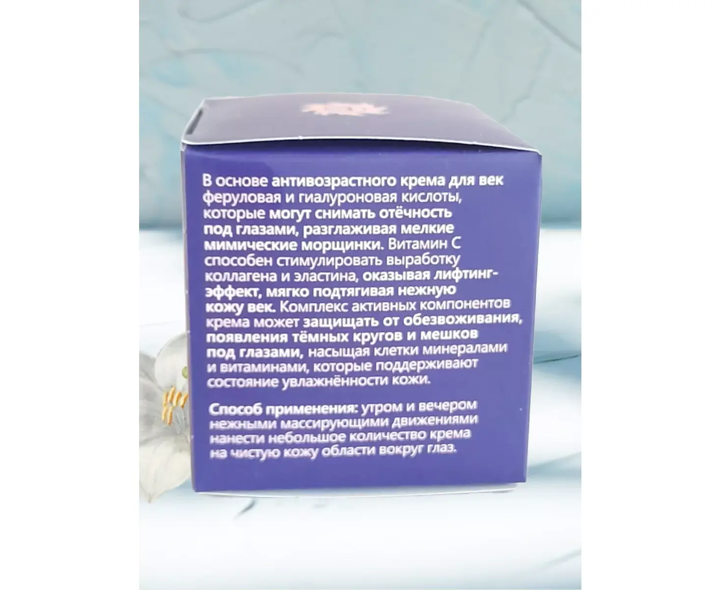 Способ применения: утром и вечером нежными массирующими движениями нанести небольшое количество крема на чистую кожу области вокруг глаз.