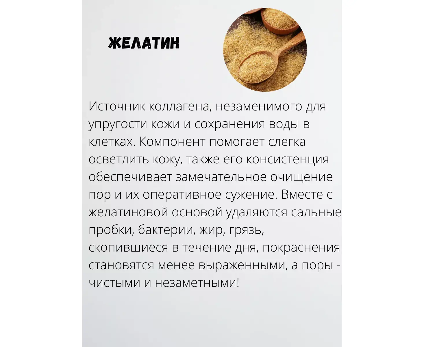 Желатин - не только кулинарный помощник, но и источник коллагена, незаменимого для упругости кожи и сохранения воды в клетках. Компонент помогает избавиться от морщинок, слегка осветлить кожу, также его консистенция обеспечивает замечательное очищение пор и их оперативное сужение. Вместе с желатиновой основой удаляются сальные пробки, бактерии, жир, грязь, скопившиеся в течение дня, покраснения становятся менее выраженными, а поры - чистыми и незаметными!