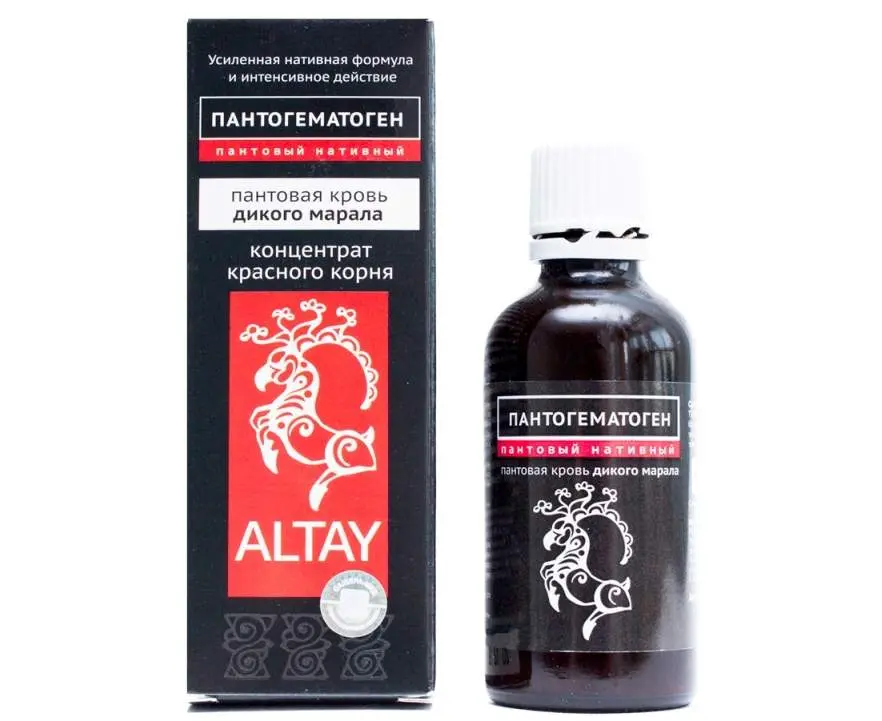 Ингредиентный состав: кровь пантов алтайского марала нативная, нативный концентрат красного корня, нативный сок корневищ копеечника чайного, витамин С.