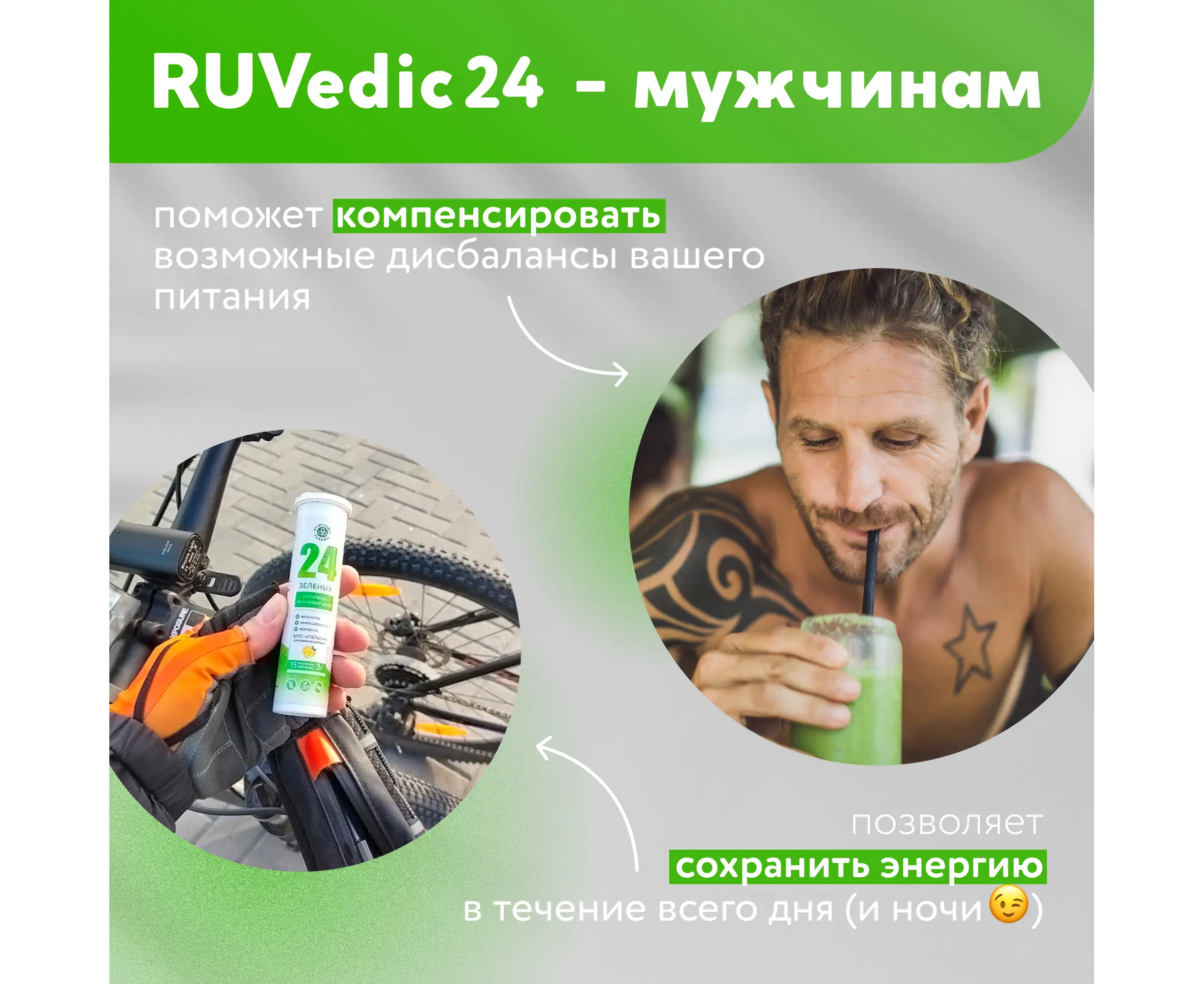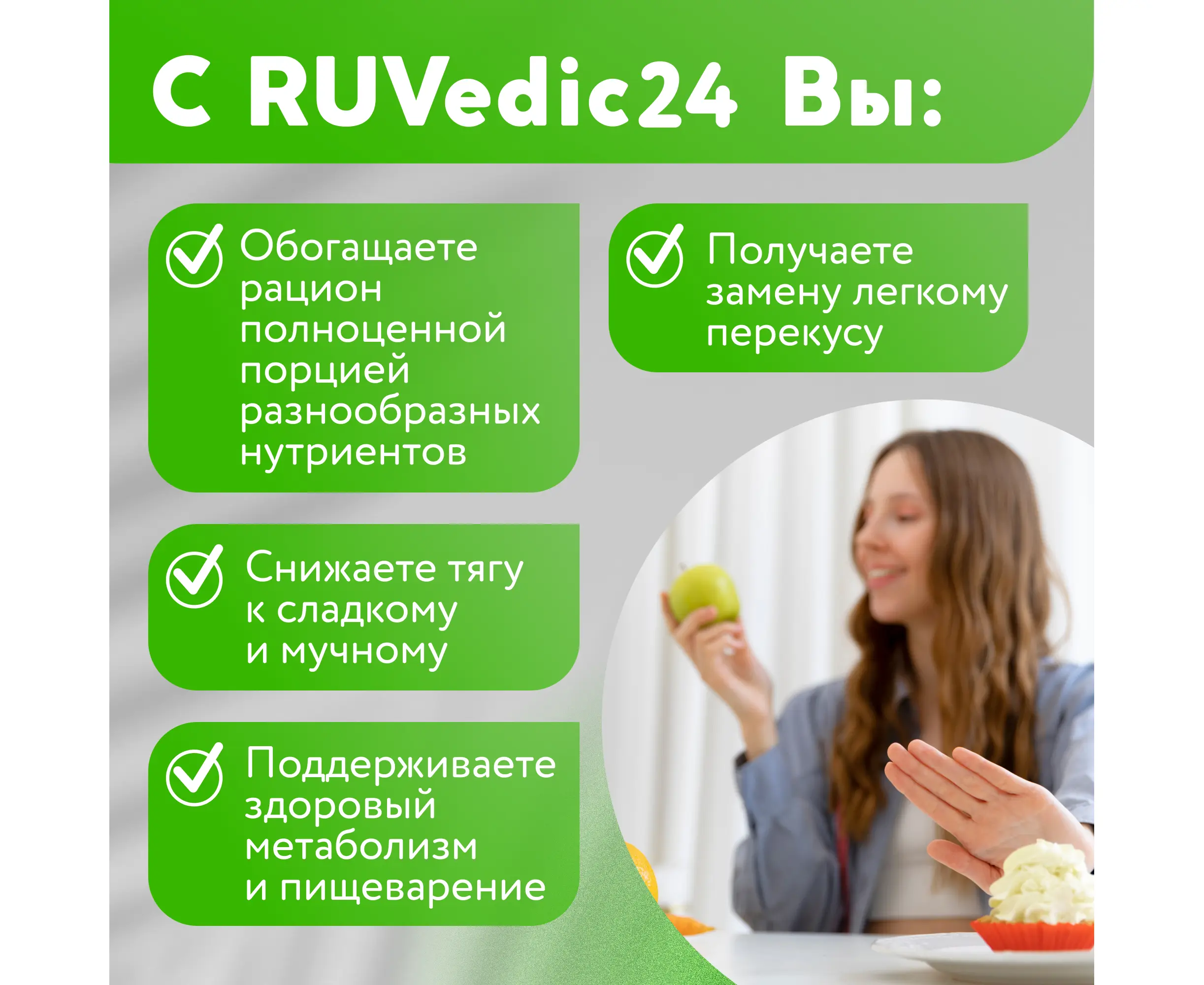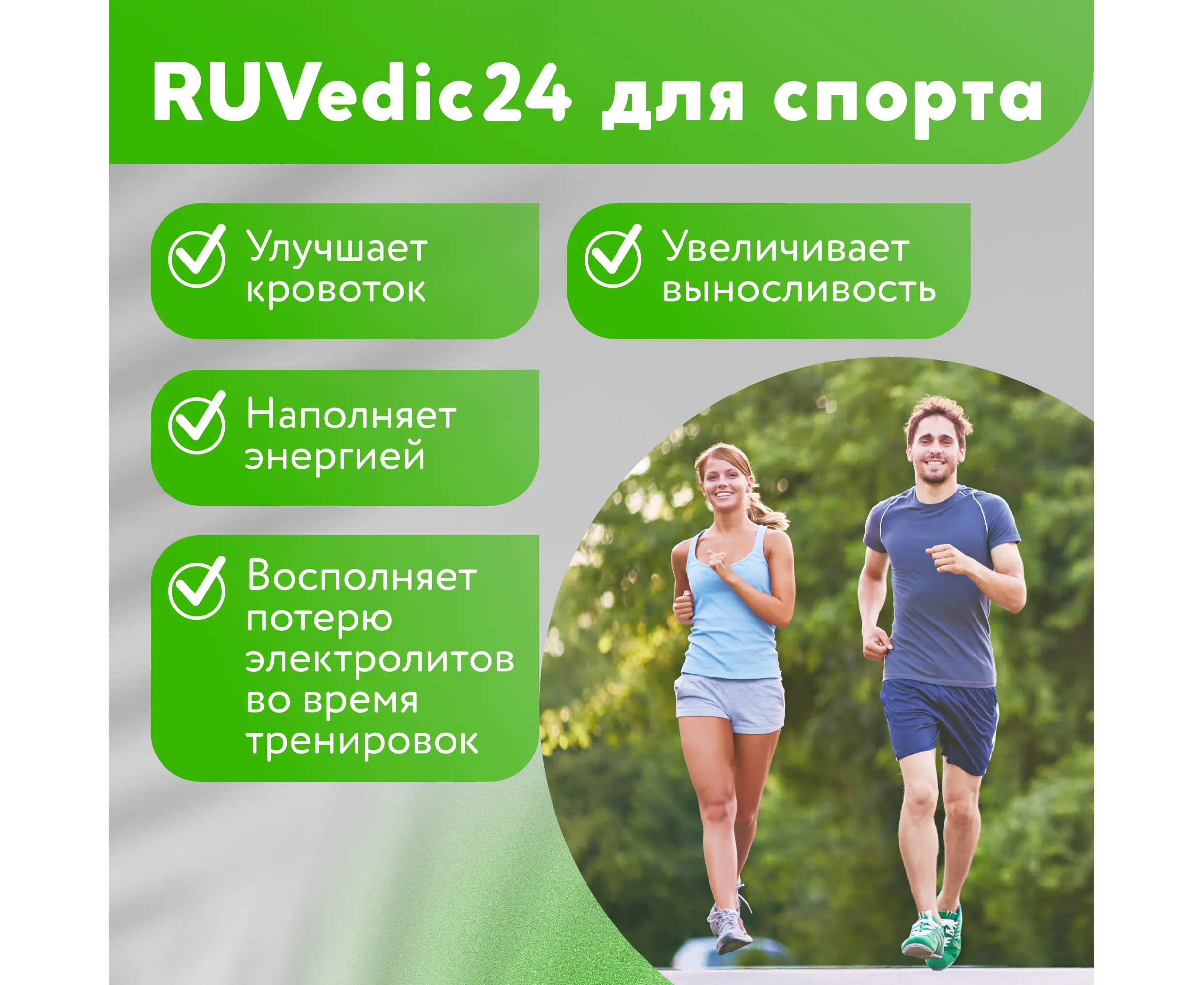 "RUVedic® 24" - современный фитонапиток, подаренный нам Индией. Это комплекс на каждый день для активных людей с высокими требованиями к тому, что делает их жизнь лучше, а здоровье крепче. Богатый комплекс из 24-х наиболее эффективных для здоровья индийских трав, усиленный изотоническим комплексом (витамины, минералы, пищеварительные ферменты амилаза, липаза, протеаза, целлюлаза, бромелайн), закладывает основу для правильной работы ЖКТ и наполняет Вас энергией на 24 часа!