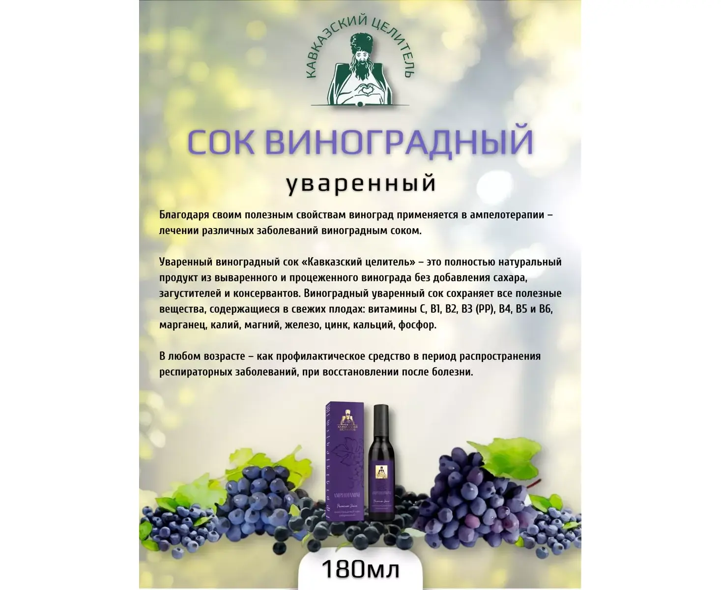 Благодаря своим полезным свойствам виноград применяется в ампелотерапии – лечении различных заболеваний виноградным соком. Уваренный виноградный сок «Кавказский целитель» – это полностью натуральный продукт из вываренного и процеженного винограда без добавления сахара, загустителей и консервантов. Виноградный уваренный сок сохраняет все полезные вещества, содержащиеся в свежих плодах: витамины C, B1, B2, B3 (PP), B4, B5 и B6, марганец, калий, магний, железо, цинк, кальций, фосфор.