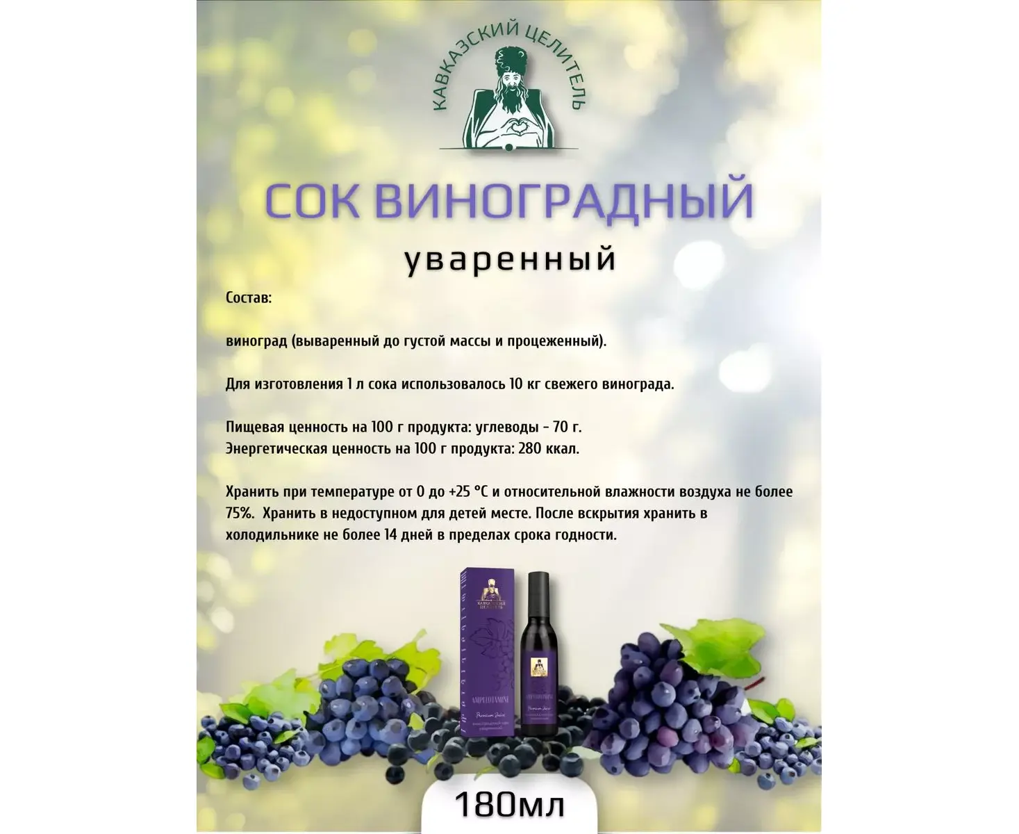 Описание Сок виноградный, уваренный, 180 мл, Кавказский Целитель