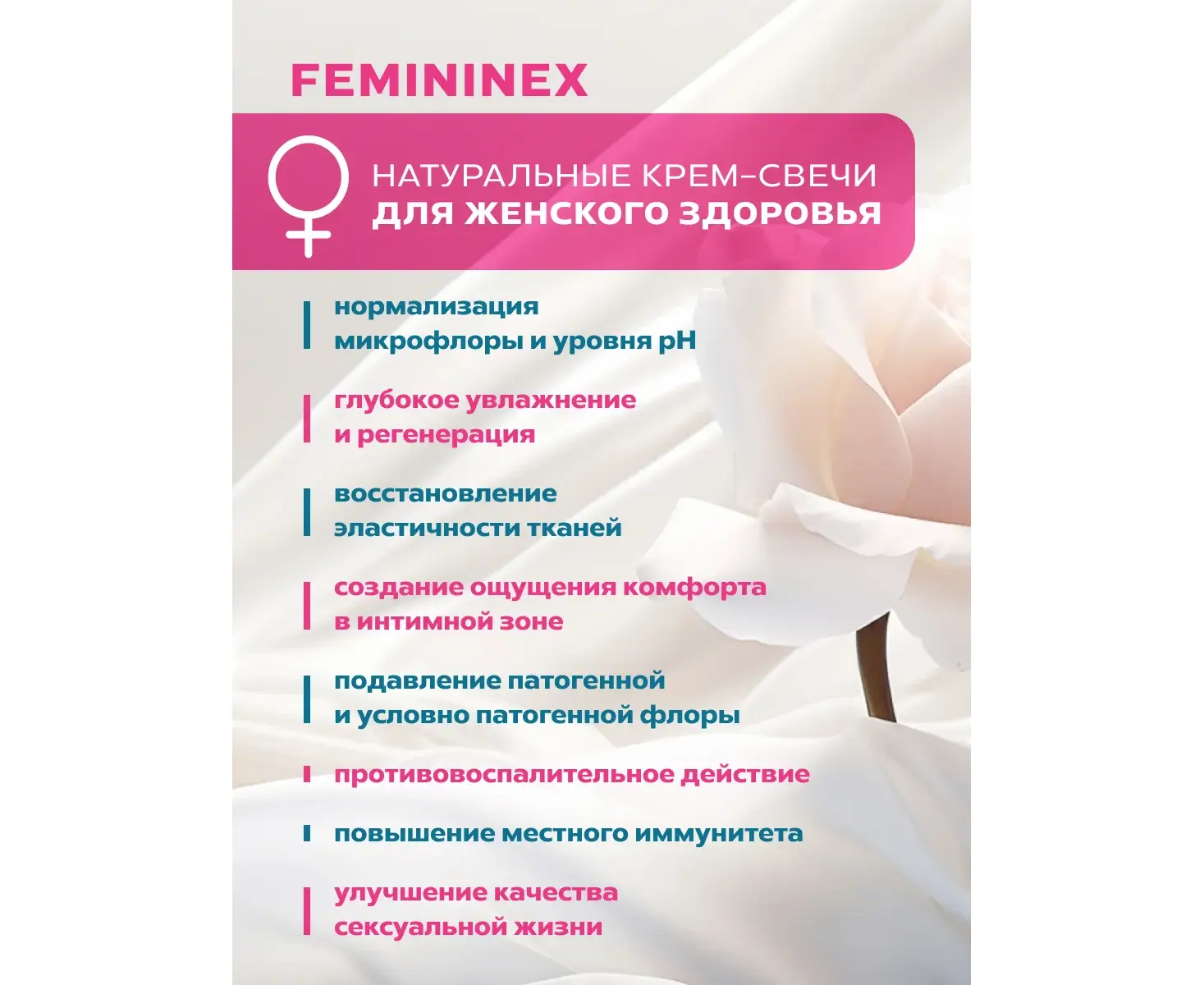 Гинекологические суппозитории "ФЕМИНИНЕКС" рекомендованы для нормализации микрофлоры и уровня pH, для повышения местного иммунитета, для восстановления эластичности тканей и создания ощущения комфорта в интимной зоне при зуде, сухости и раздражениях, вызванных гормональными изменениями и дисбалансом микрофлоры.