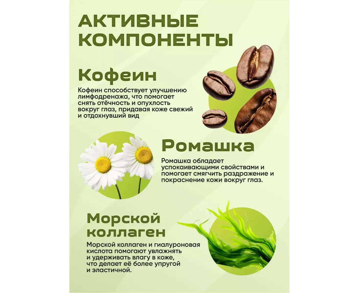 Снимает отёчность. Кофеин в составе патчей способствует улучшению лимфодренажа, что помогает снять отёчность и опухлость вокруг глаз, придавая коже свежий и отдохнувший вид.