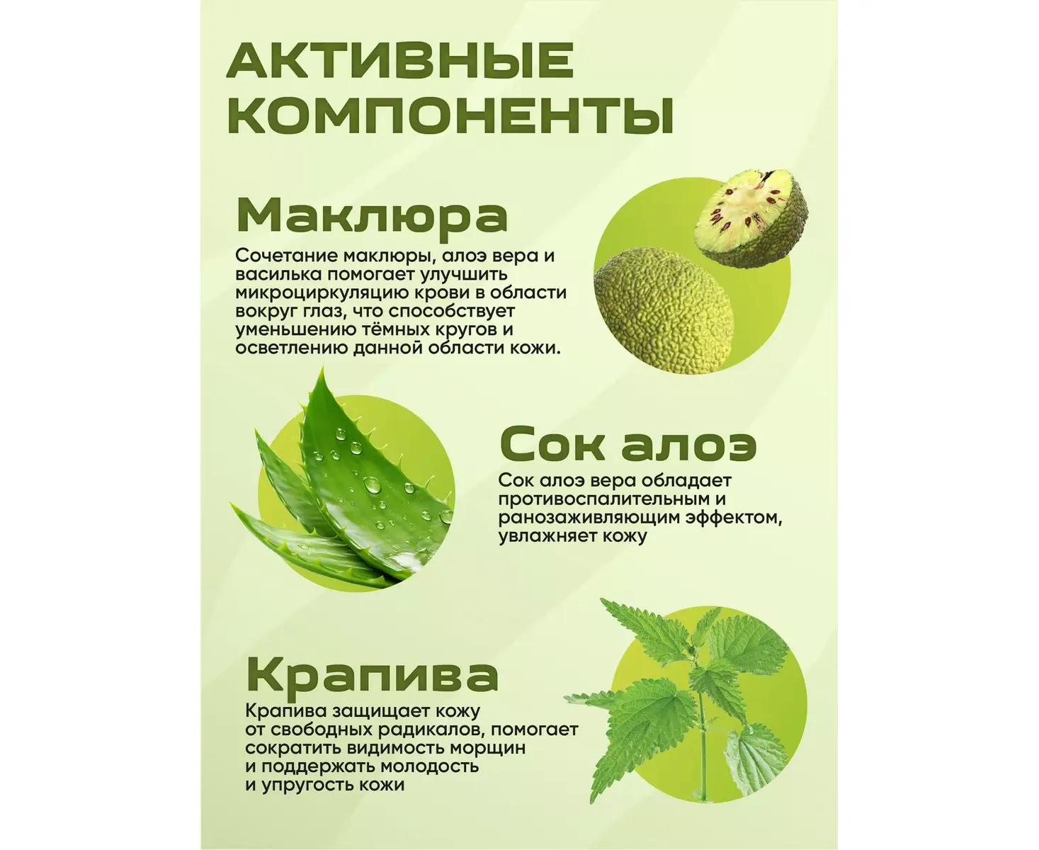 Уменьшает тёмные круги. Сочетание маклюры, алоэ вера и василька помогает улучшить микроциркуляцию крови в области вокруг глаз, что способствует уменьшению тёмных кругов и осветлению данной области кожи.