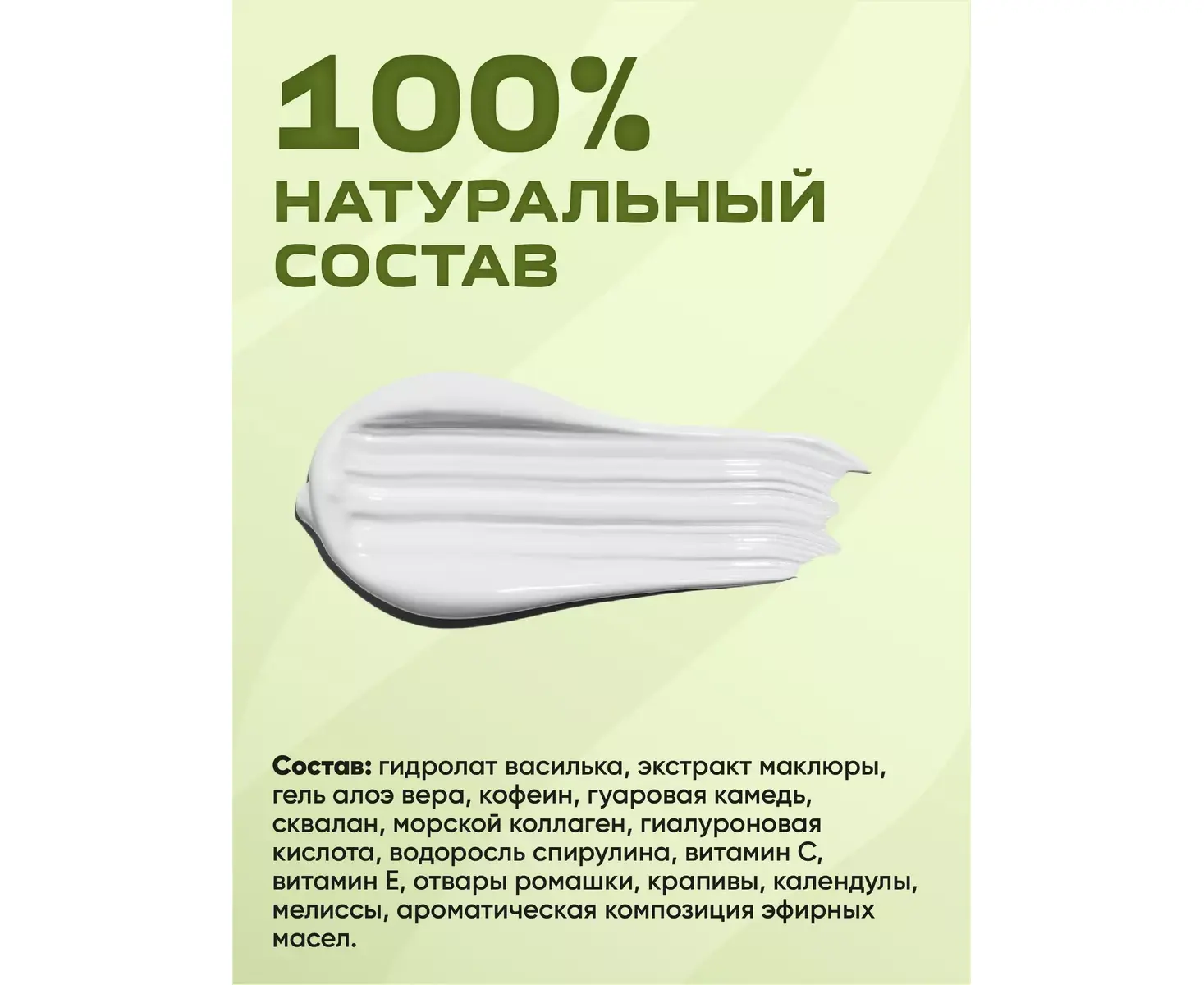 Состав: гидролат василька, экстракт маклюры, гель алоэ вера, кофеин, гуаровая камедь, сквалан, морской коллаген, гиалуроновая кислота, водоросль спирулина, витамин С, витамин Е, отвары ромашки, крапивы, календулы, мелиссы, ароматическая композиция эфирных масел.