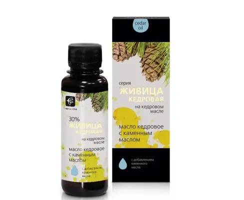 Состав: масло кедровое – 60%, живица кедровая – 30%, каменное масло – 10%.